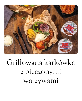 Grillowaną karkówkę podawaj razem z warzywami. Na ciepłe mięso nałóż ser smażony z kminkiem. Pod wpływem temperatury ser pięknie się rozleje po mięsie. Ser możesz również położyć na ciepłe warzywa i osiągniesz też świetny efekt.