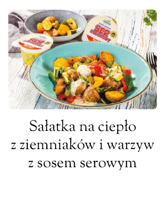 Sałatkę na ciepło podawaj polaną przygotowanym sosem serowym z pietruszką.